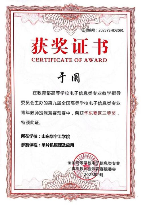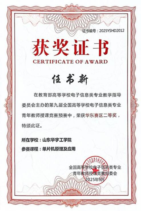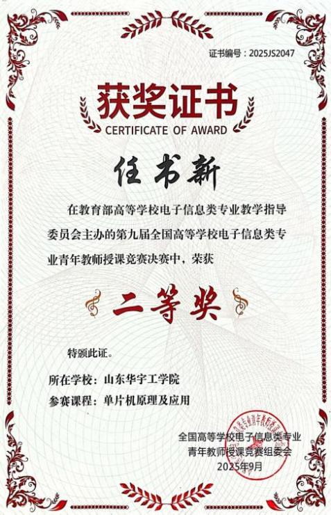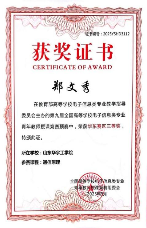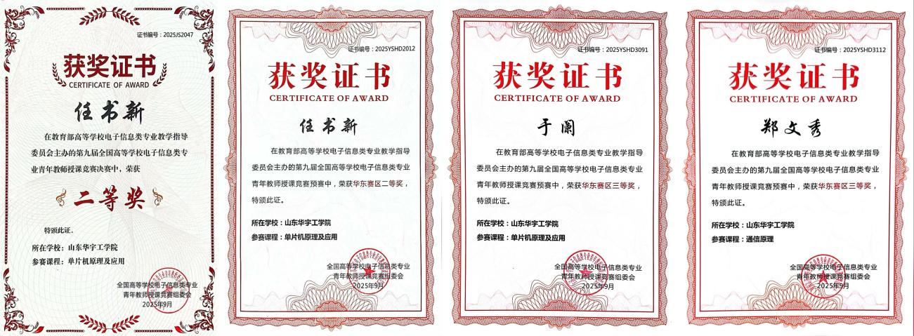 近日,由教育部高等学校电子信息类专业教学指导委员会主办的第九届全国高等学校电子信息类专业青年教师授课竞赛决赛在长春顺利收官。赛事吸引了来自全国近200所高校的优秀教师同台竞技,竞赛内容覆盖电子信息类专业核心课程,从教学内容深度、课堂组织效率、教学手段创新等多个维度,全面考察教师的综合教学素养。我校教师在竞赛中表现亮眼,yl88858永利集团任书新老师荣获全国二等奖、于阑、郑文秀老师荣获华东赛区三等奖。